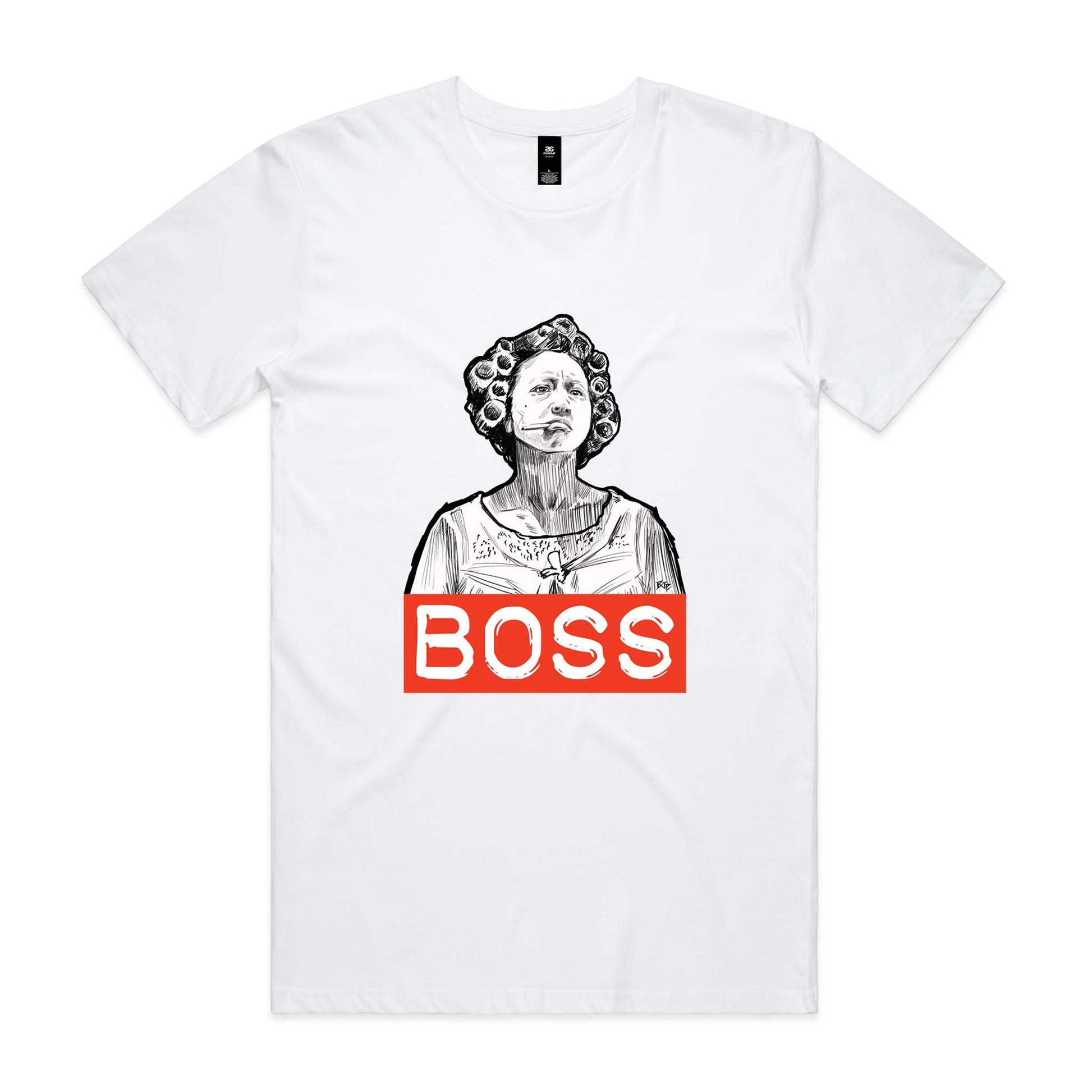 The Landlady from Kung Fu Hustle in all her glory—hair in rollers, cigarette kicked off to the side of her mouth, eyes locked in that “I'm gonna smack you with my sandal? ” stare. Underneath, stamped in bold, undeniable type: BOSS Because… obviously.